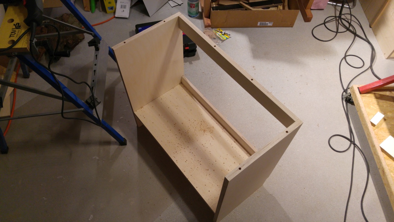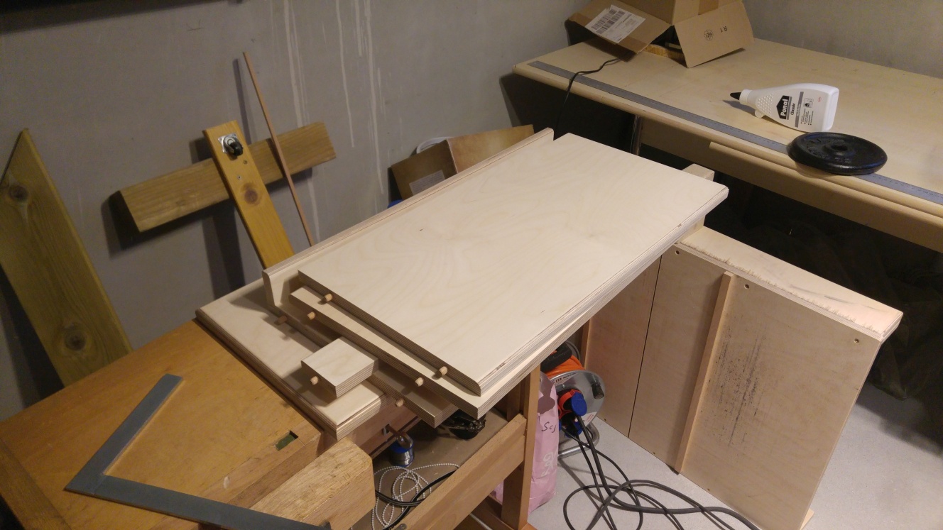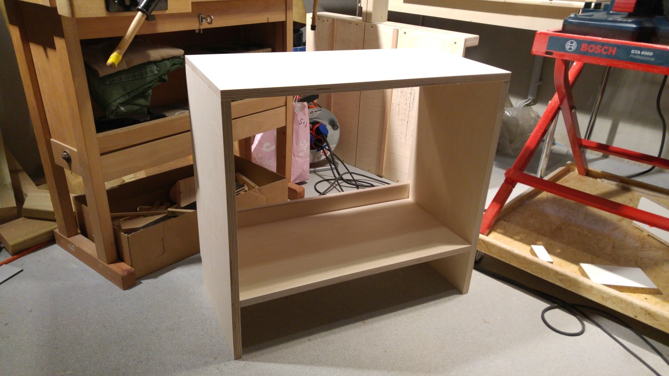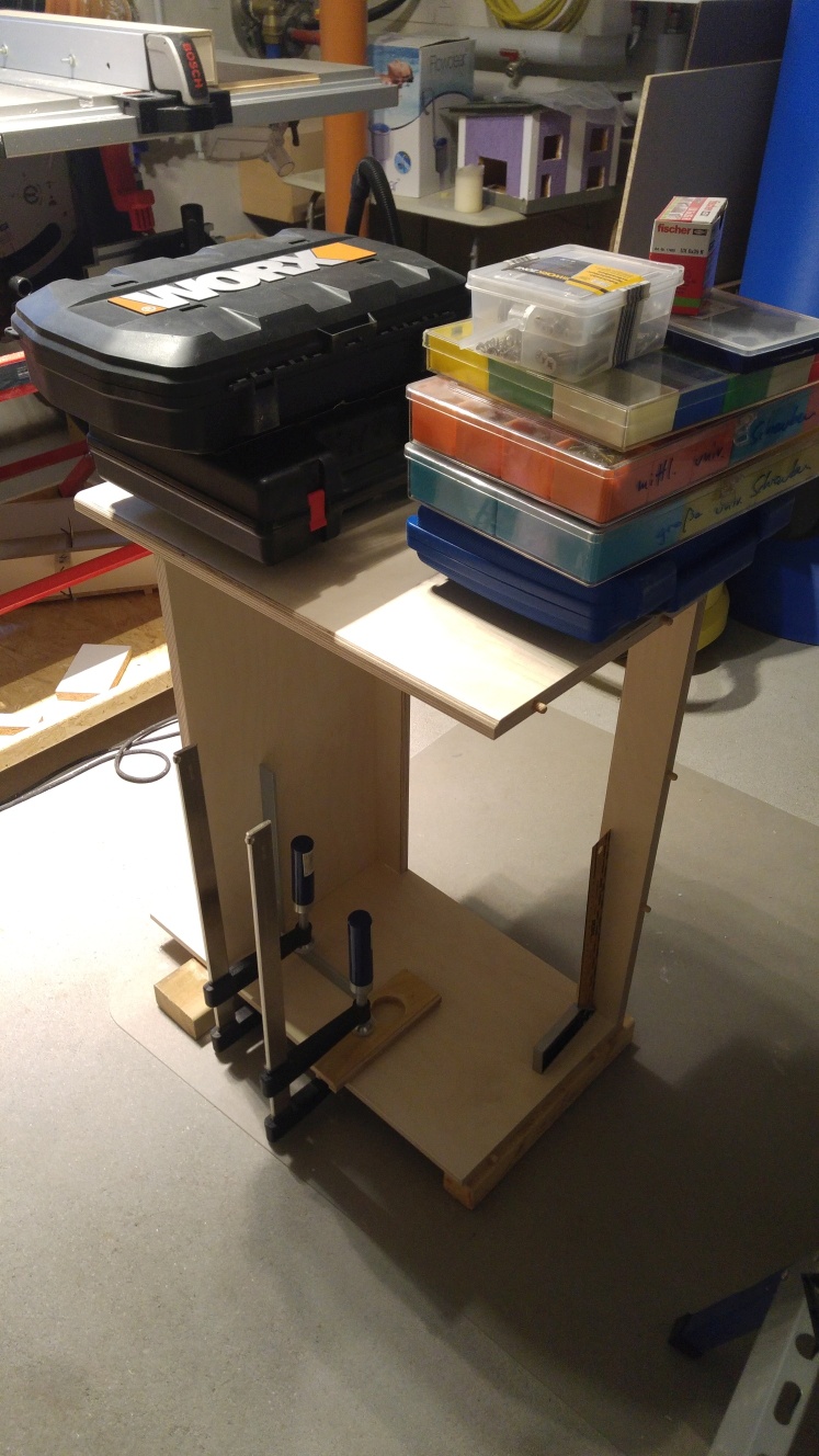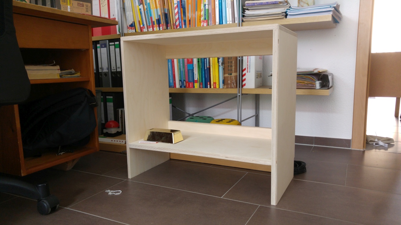 Die liebe Oma wünschte sich ein Tischchen, das genau in die Nische zwischen Bett und Kommode passt und die selbe Höhe aufweist wie die Kommode. Aus Multiplex ist so etwas recht schnell hergestellt.