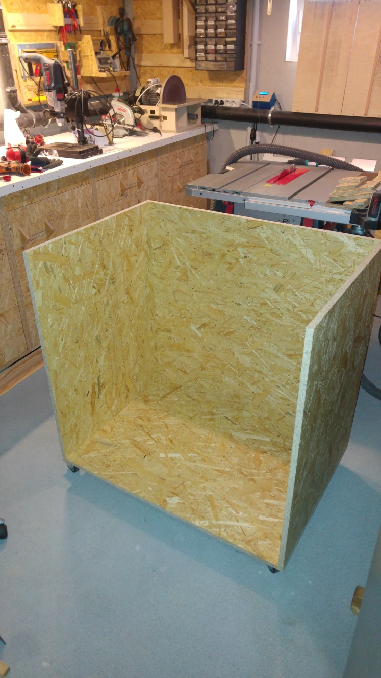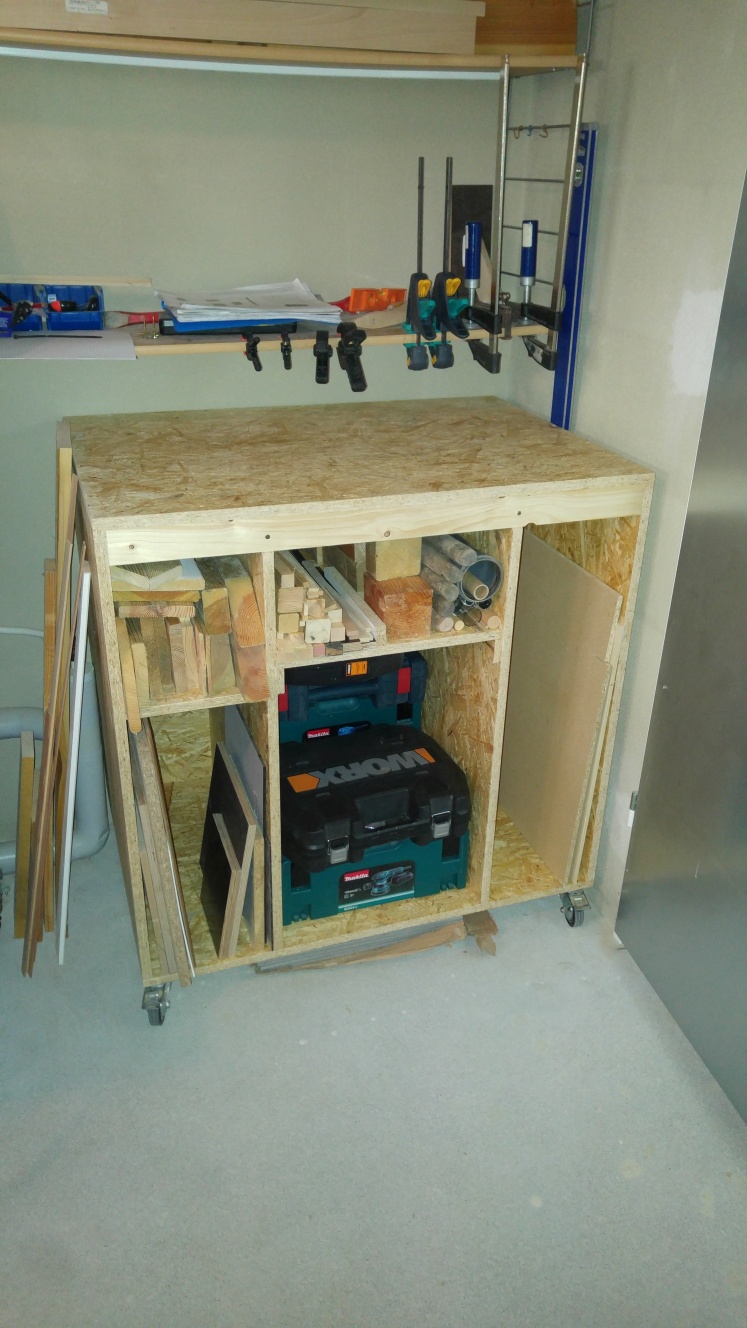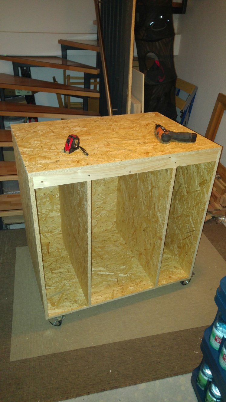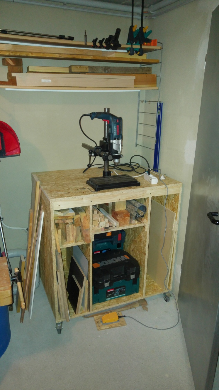 In meiner Werkstatt türmten sich Holzreste in allen Ecken. Es war Zeit für eine Art Regal, in dem die übrigen Teile zumindest grob sortiert gelagert werden konnten. Zudem muss das ganze aufgrund des Platzmangels jederzeit weggerollt werden können. Letztlich dient die Oberseite noch als Arbeitsfläche und trägt inzwischen den Bohrständer.
