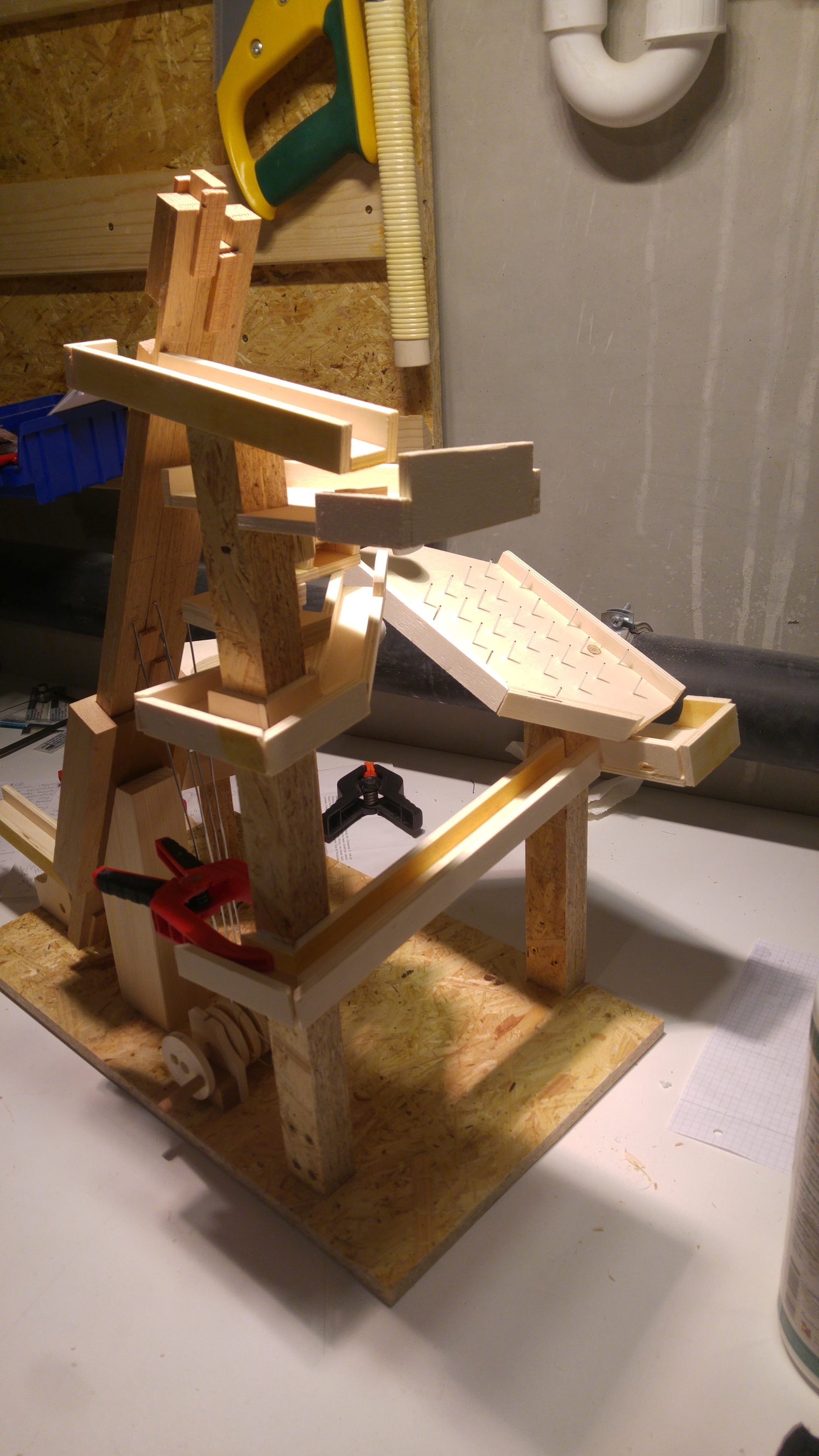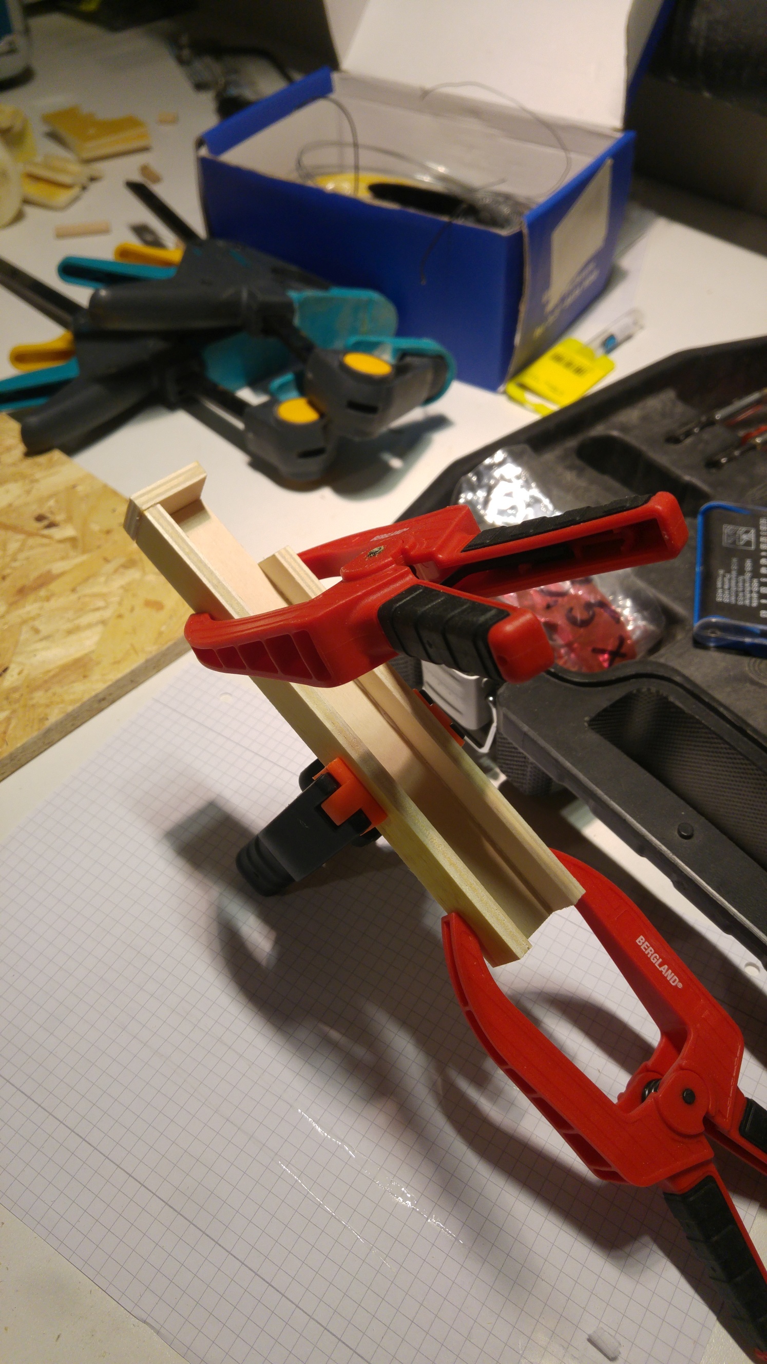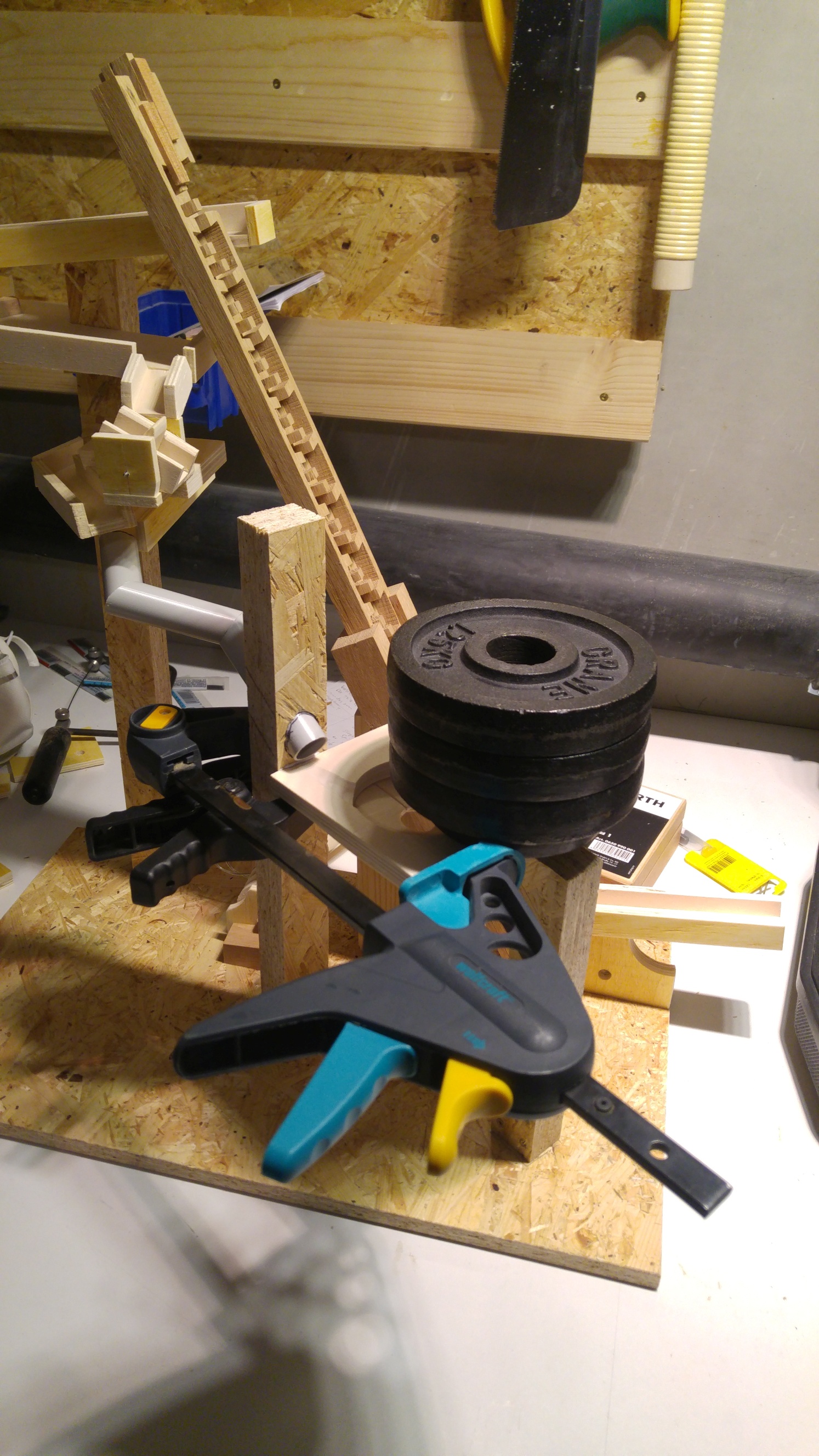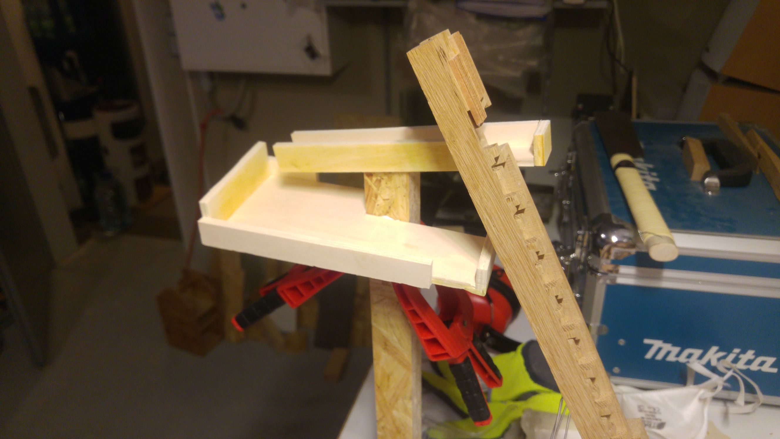 Inzwischen habe ich auch eine Halterung für die Leiter gebaut, in der die Streifen (mit etwas Wachs) gut rauf und runter gleiten können