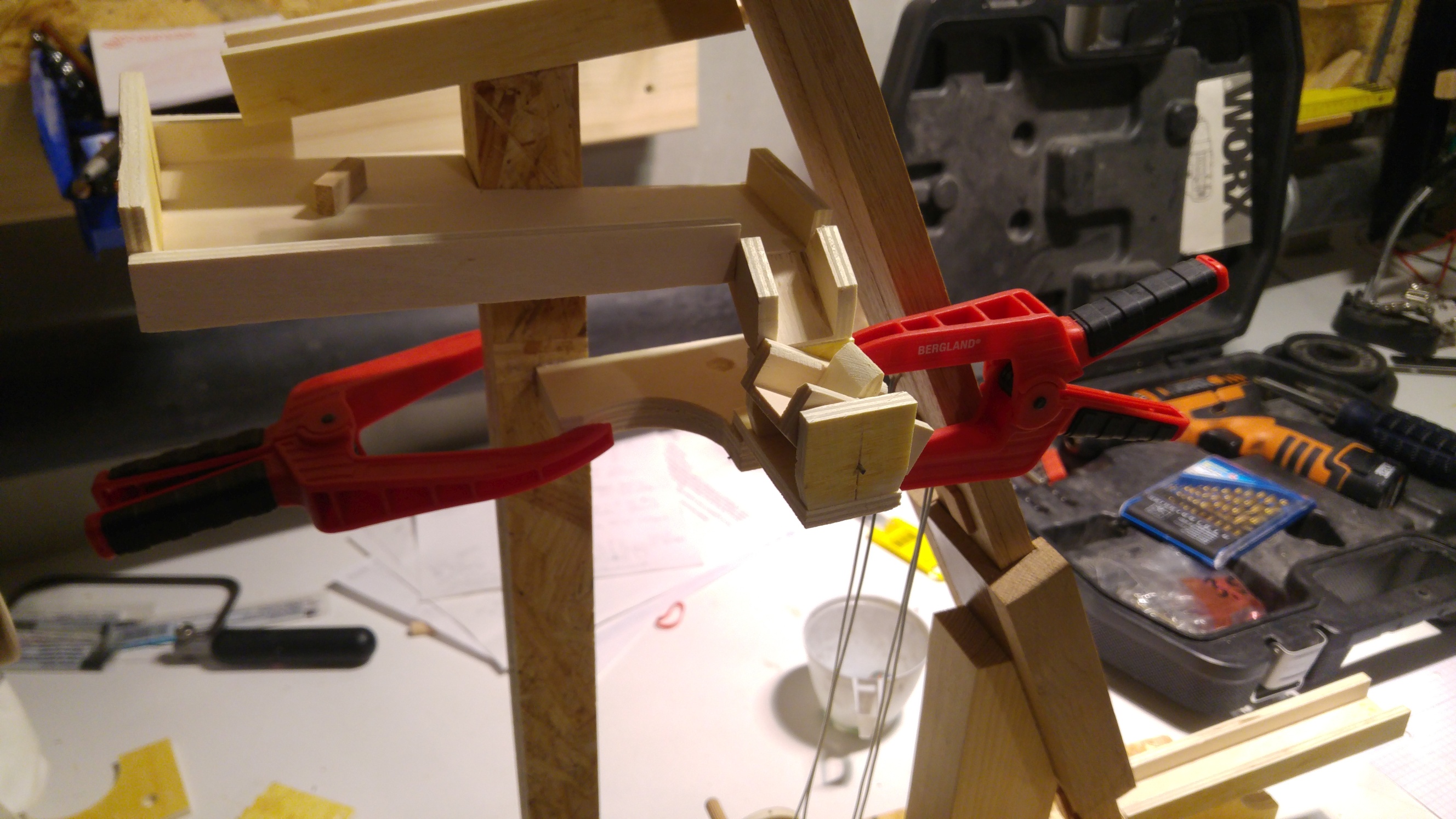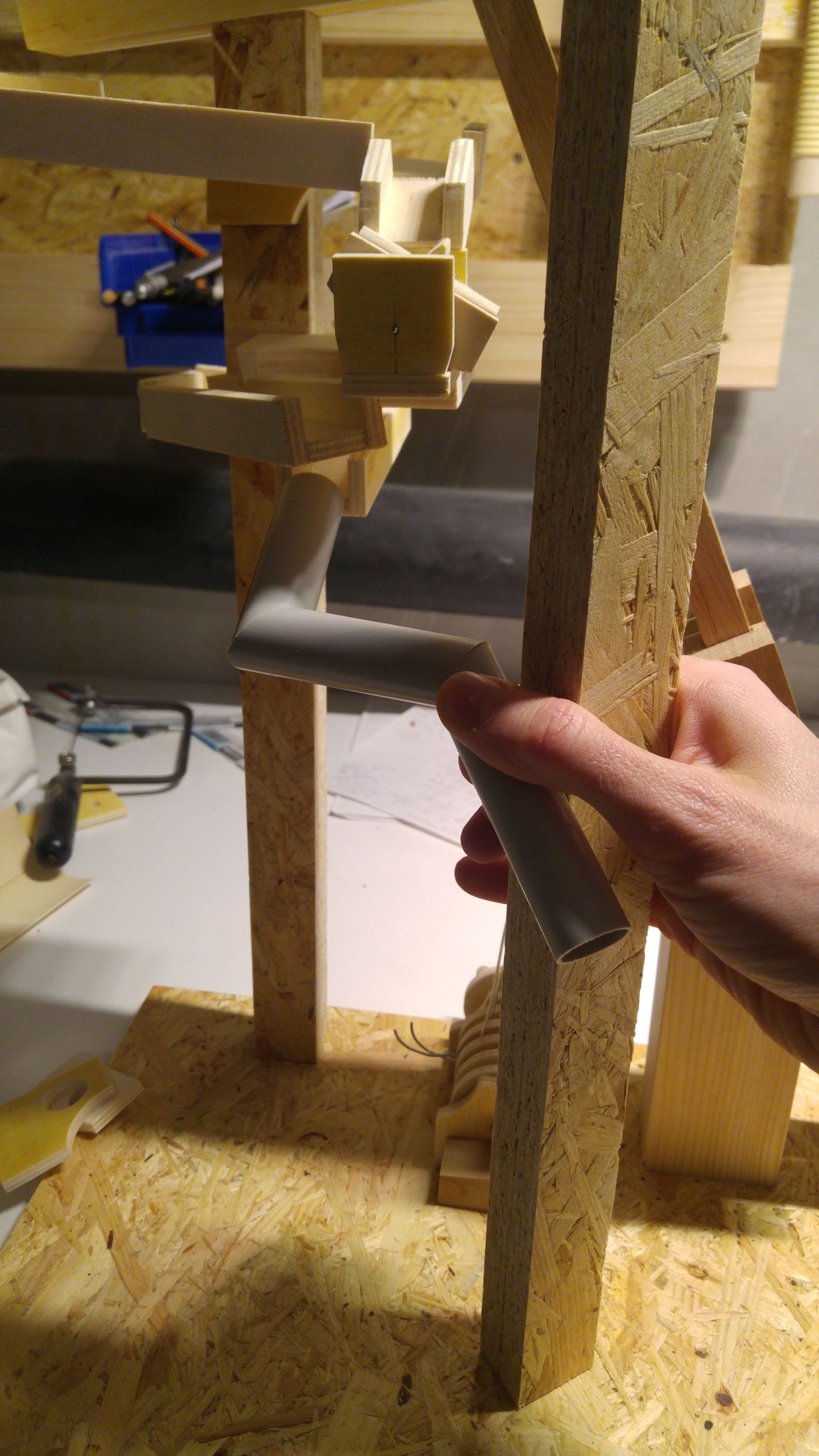 Ein Teil der Bahn wird zusammengeleimt. Diese Schiene fängt die Murmeln beim Ausstieg aus der Leiter