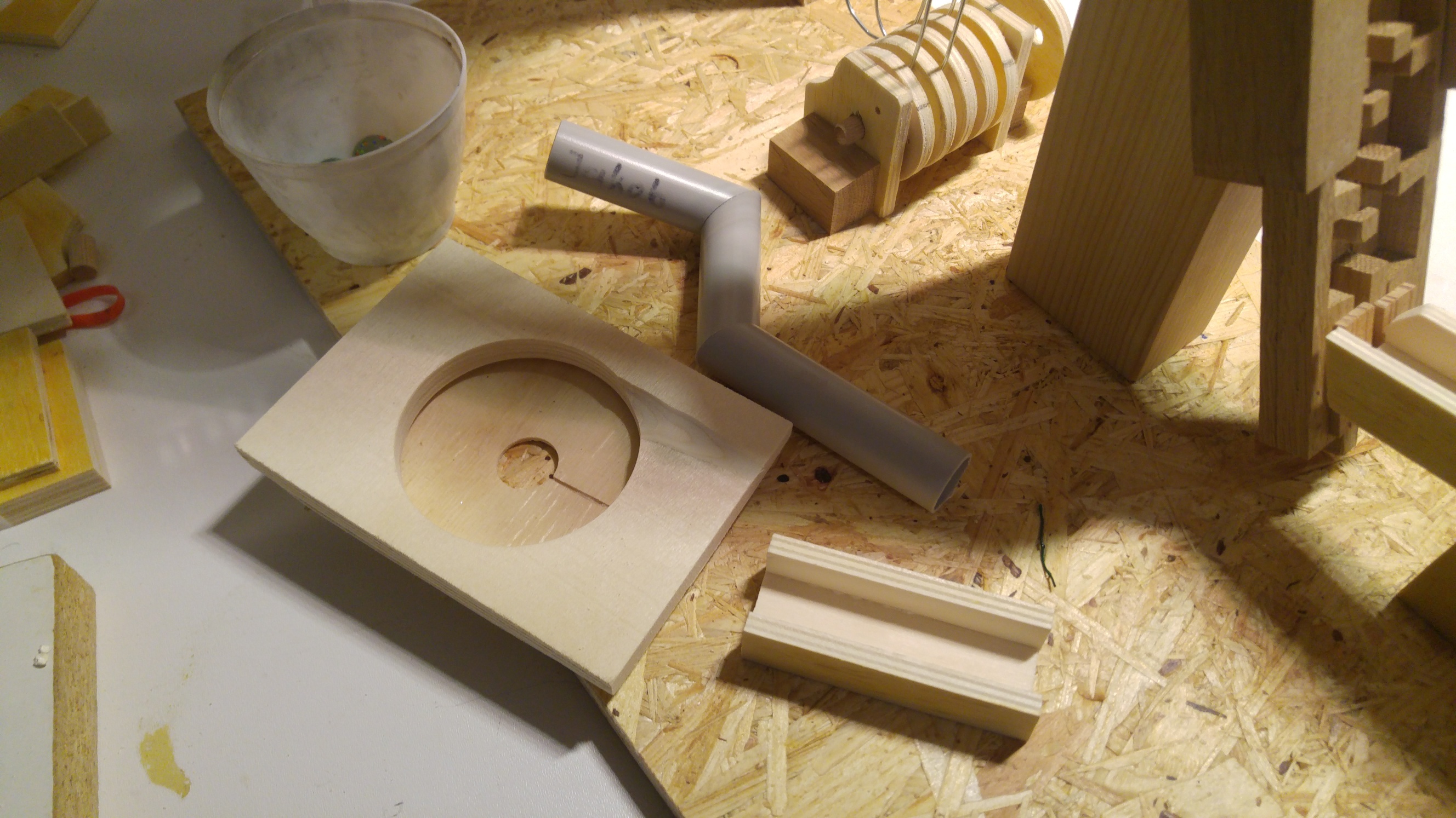 Der Trichter ist von unten an das stärkere Brettchen geschraubt