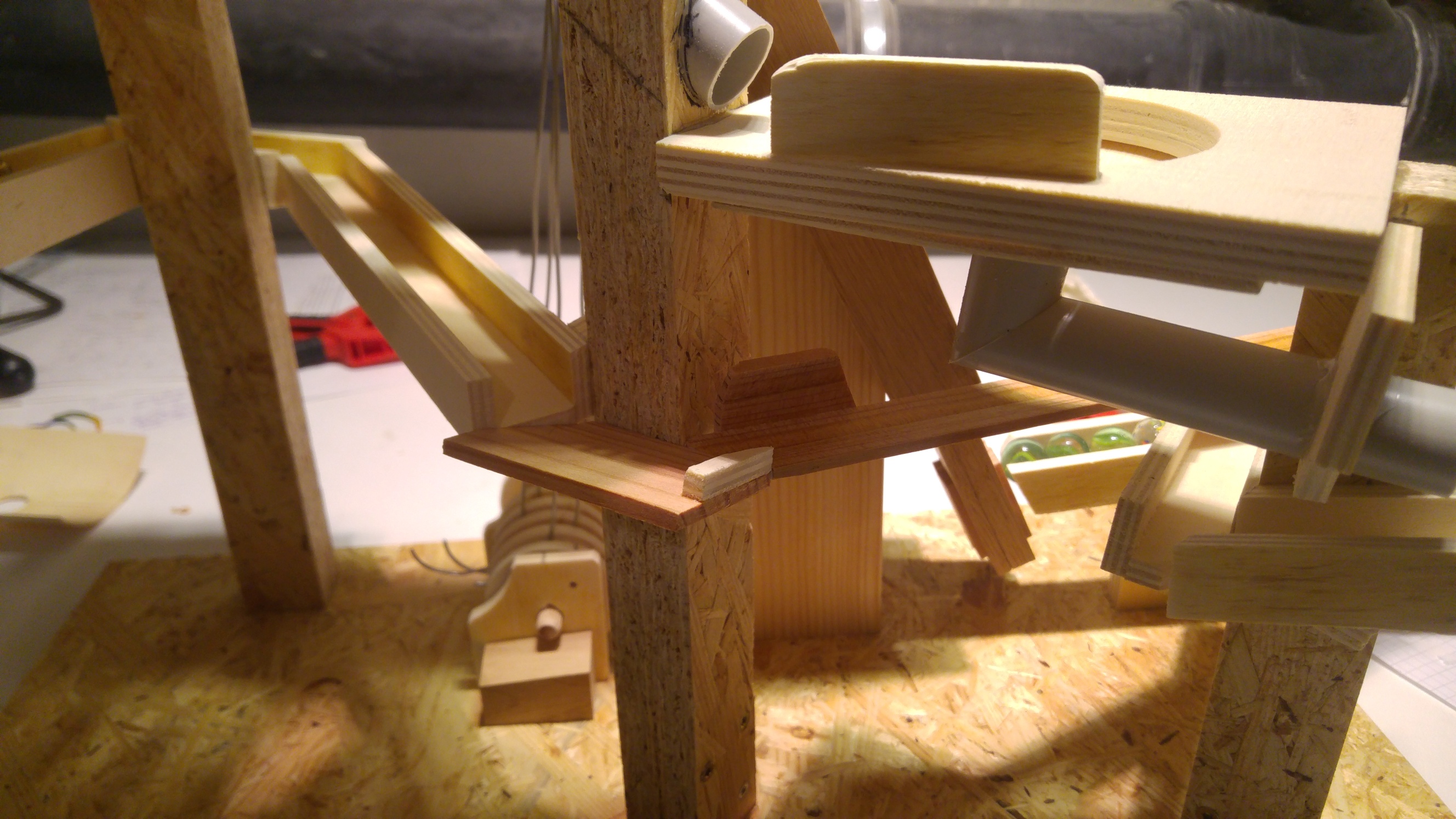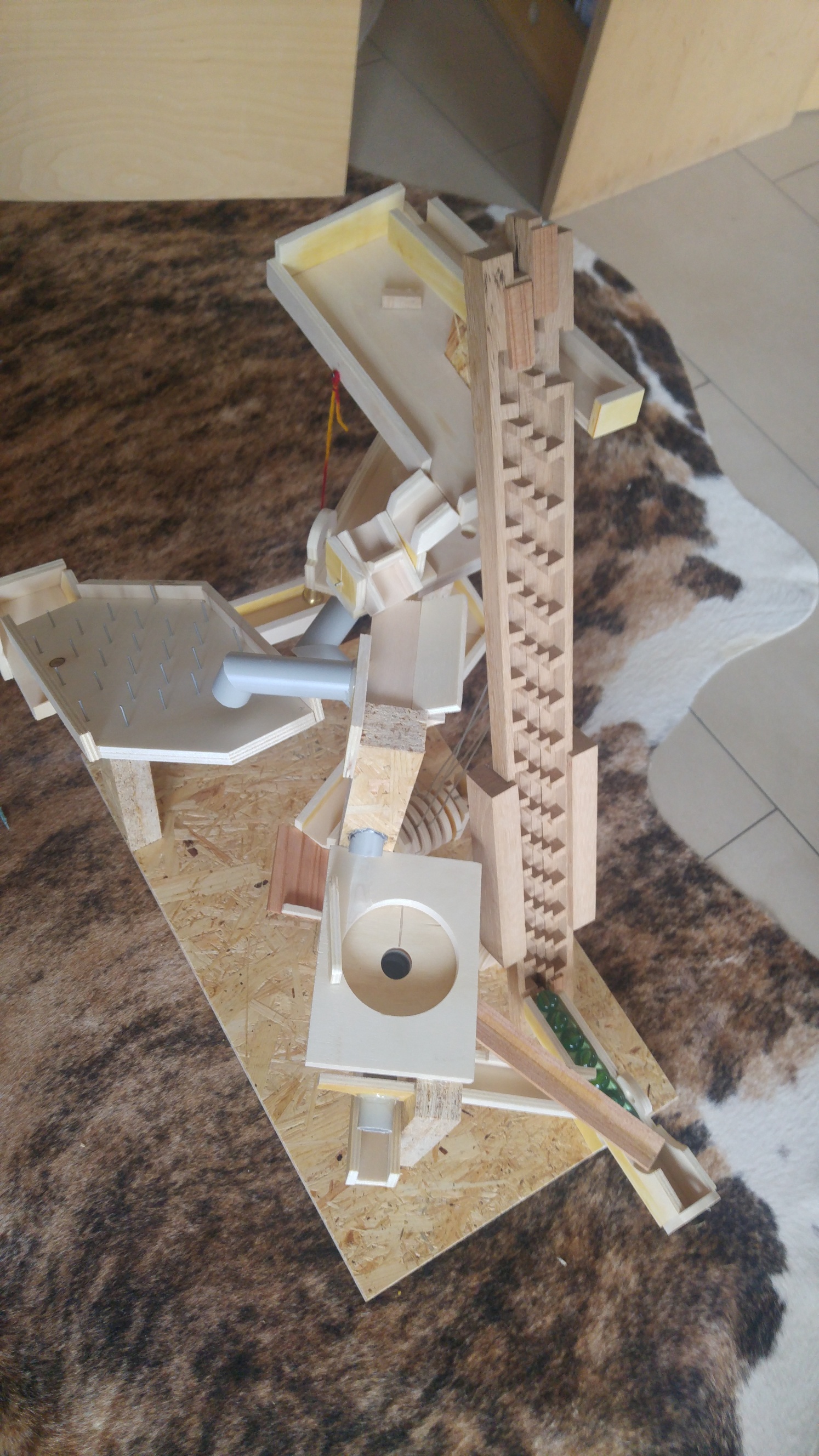 Am oberen Ende der Leiter rollen die Murmeln von der Schiene auf eine kleine Plattform