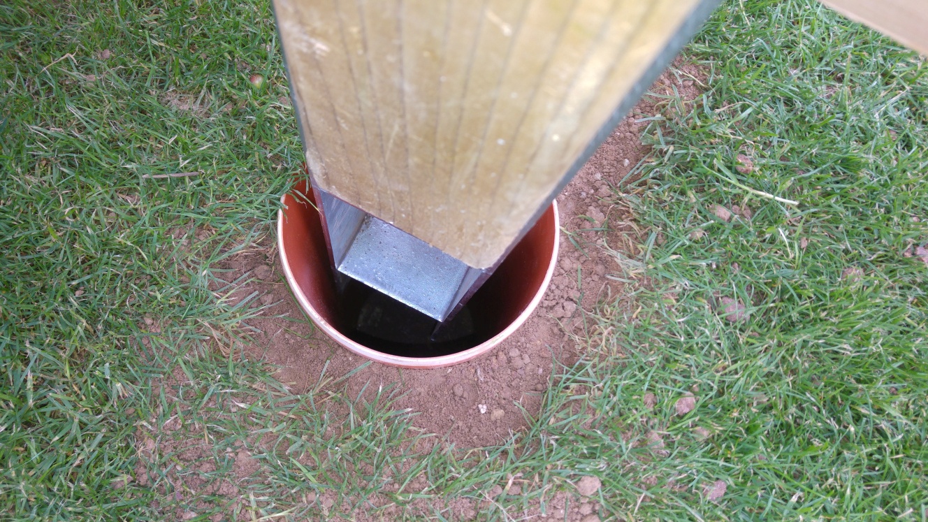 Ein H-Träger hält später den Pfosten und wird einbetoniert.