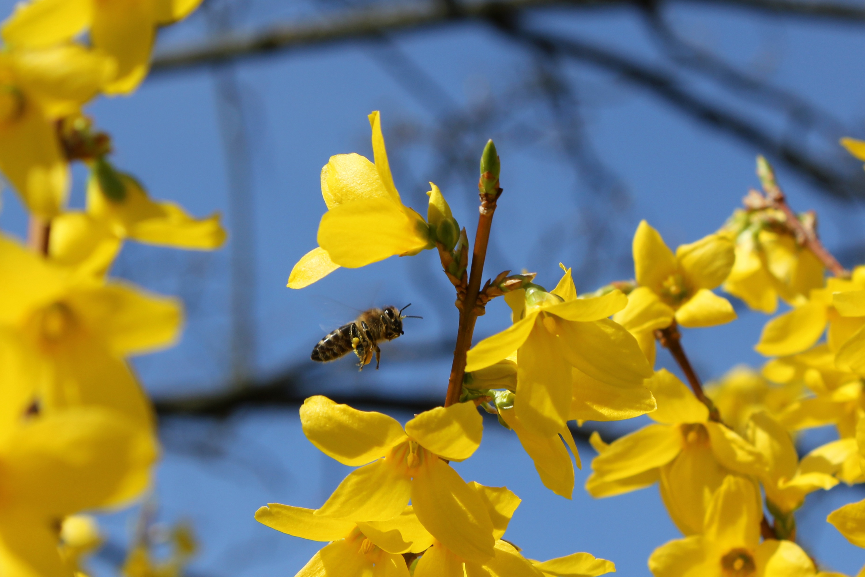 Eine Biene fliegt in einer Forsythie. Leider bietet diese keinen brauchbaren Nektar.