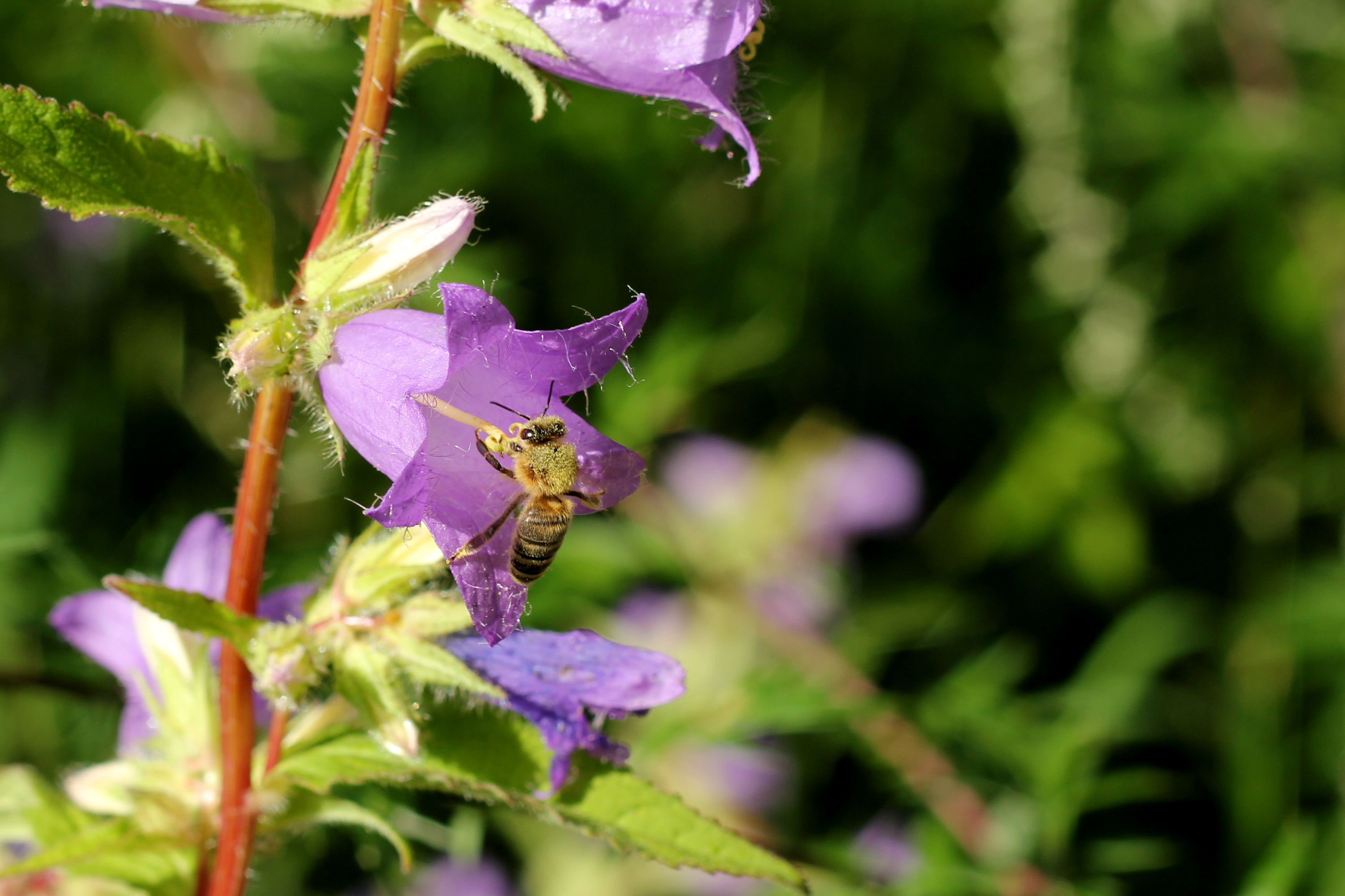 Eine Biene ganz kurz vor dem Abflug aus einer Blüte.